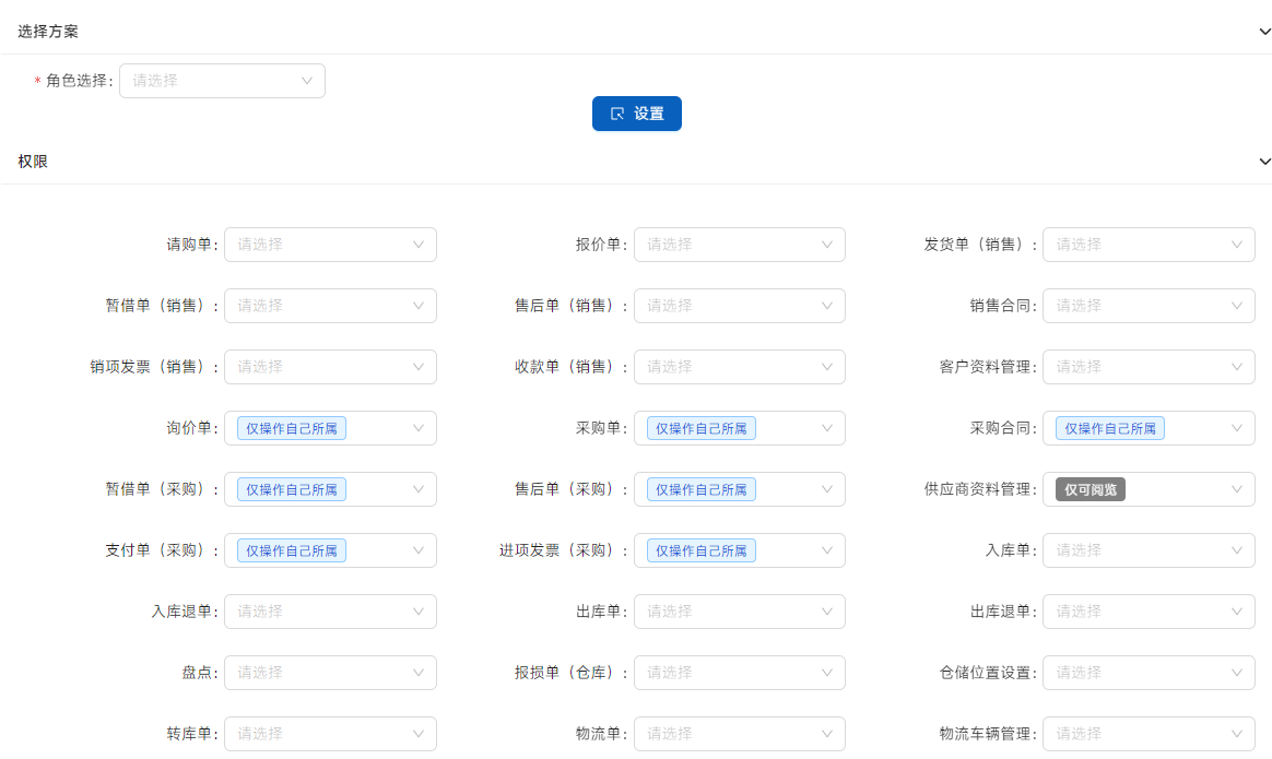 点击左侧栏目[权限设置],可以从角色选择中选择预存的方案进行设置,也可以根据具体需求进行手动修改。