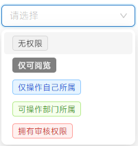 权限级别有[无权限](默认可不选,留空)、[仅可阅览](供跨部门联同作业的用户查看)、[仅操作自己所属](普通操作人员只能操作自己建立的表单)、[可操作部门所属](部门领导可以操作部门下属建立的表单)、[拥有审核权限](对流程具备审核权限的人员,同时可以对表单进行操作)。