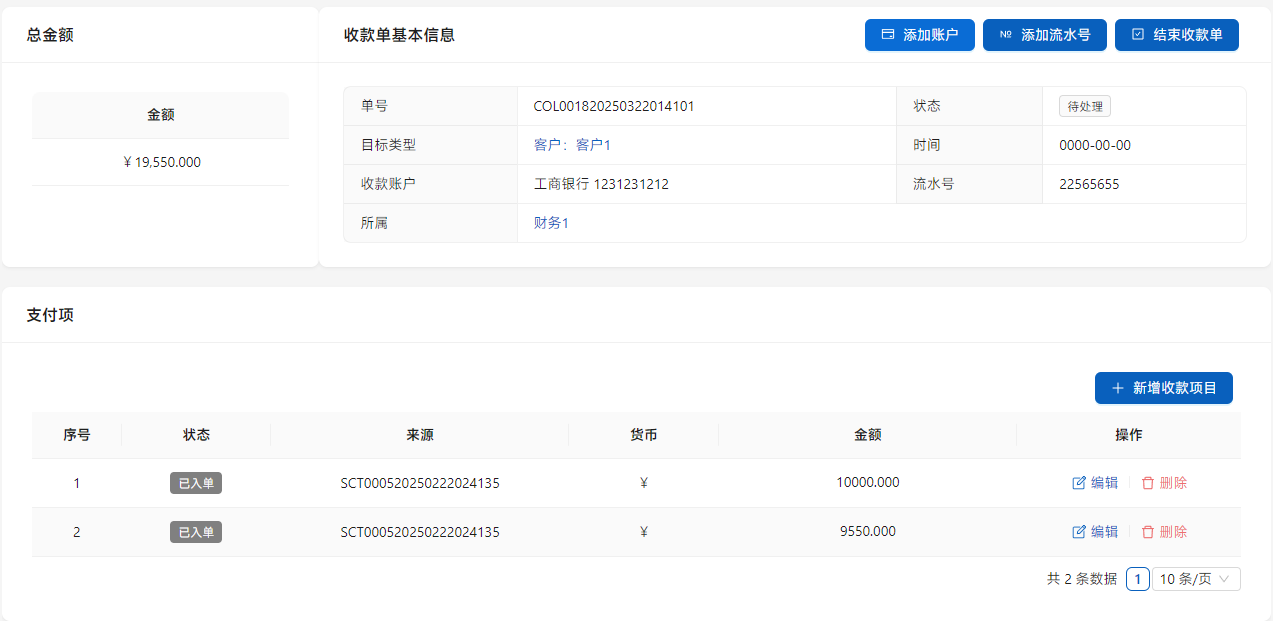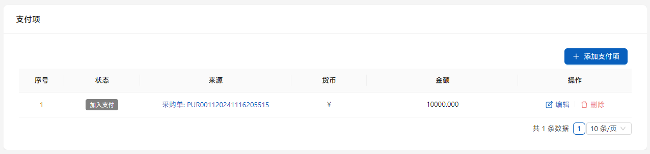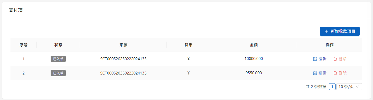 新增之后,可以点击[编辑],修改支付金额(支付货币类型无法修改),也可以点击[删除],删除该项支付。