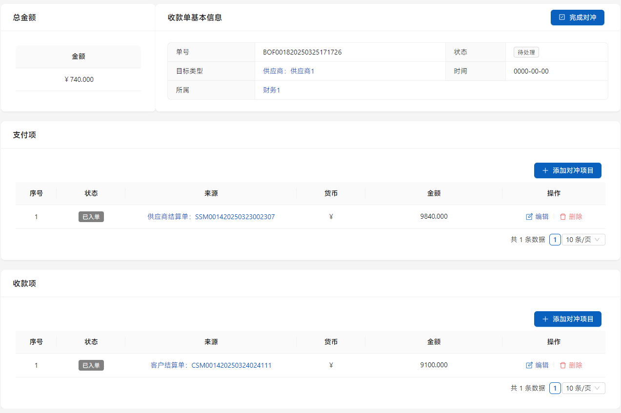 在支付、收款项中点击[添加对冲项目],可以通过列表后面的[编辑]调整金额,使得总金额为0。