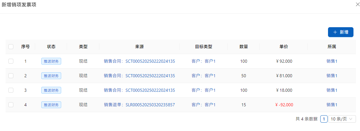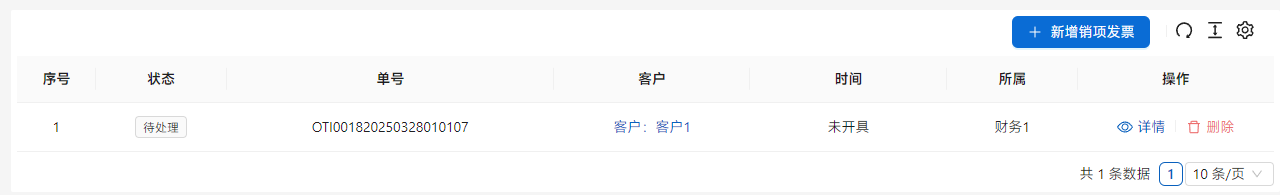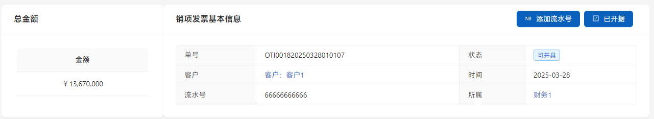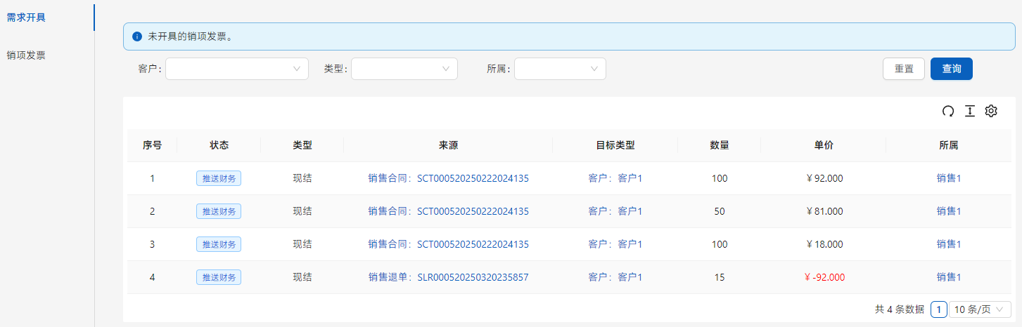 由销售部门进行提交的开具申请,开具销项发票后进行登记的单证。在[财务管理]-[销项发票]-[需求开具]中显示需要开具发票的项目。单价为负数的可单独开具红字发票,也可在普通单据中进行冲抵。