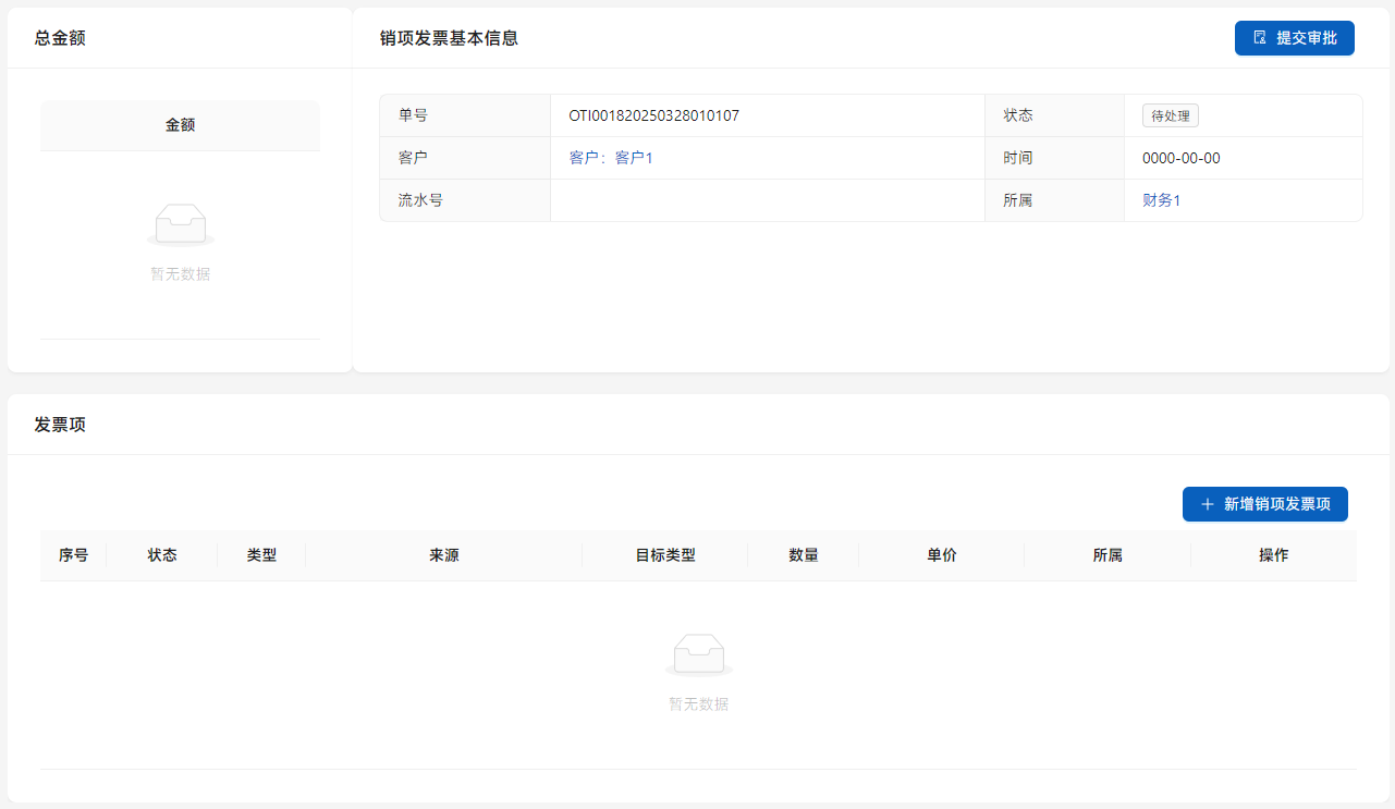 点击发票项的[新增销项发票项],添加需要开具的项目,可以点击[编辑]对数据进行修正,点击[提交审批]。