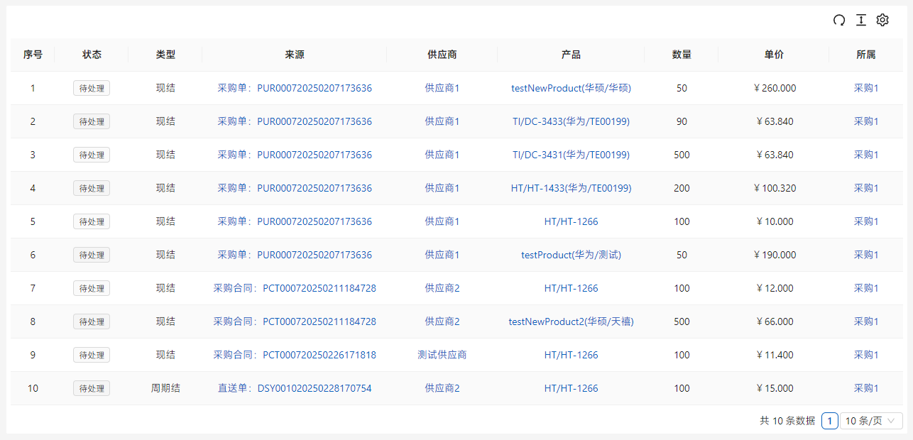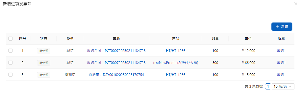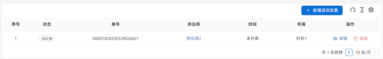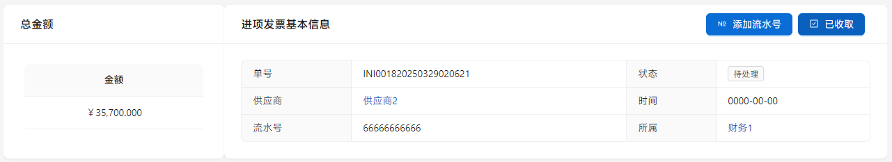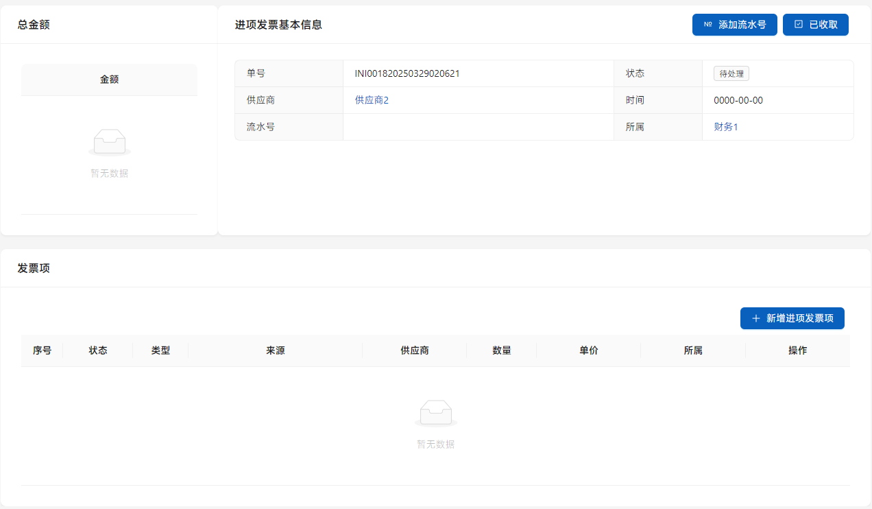 由采购部门系统自动推送的收取申请,收取进项发票后进行登记的单证。在[财务管理]-[进项发票]-[待收发票]中显示即将收到的发票的项目。单价为负数的可能为红字发票,也可在普通单据中进行冲抵。