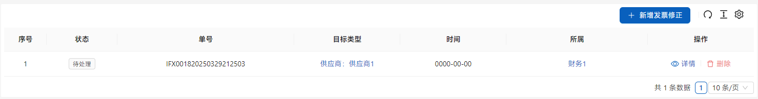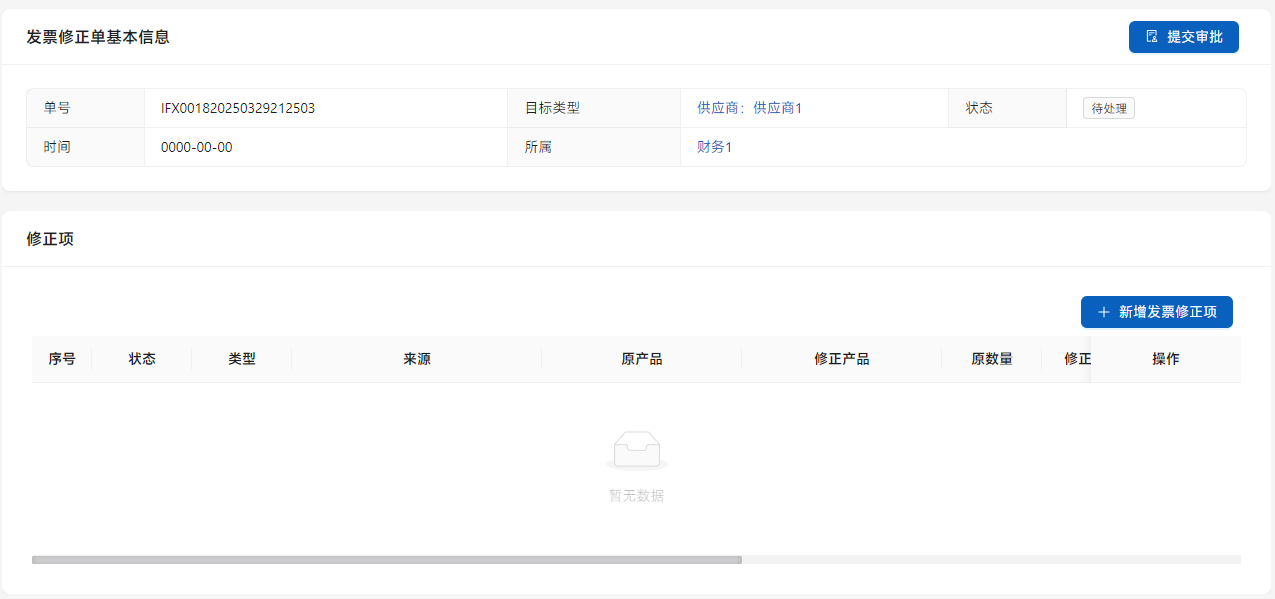 因故对发票信息进行修正的单证,不提供推荐信息,需要自行查看。在[财务管理]-[发票修正单]中显示修正过的内容。