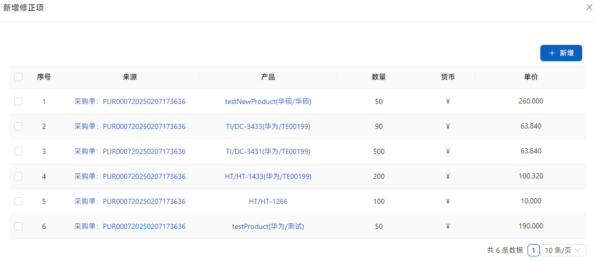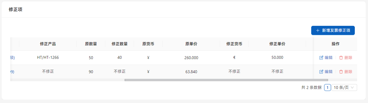 点击修正项栏目的[新增发票修正项],添加需要修正的项目。系统会根据是客户还是供应商,显示相关的可以修改的项目。