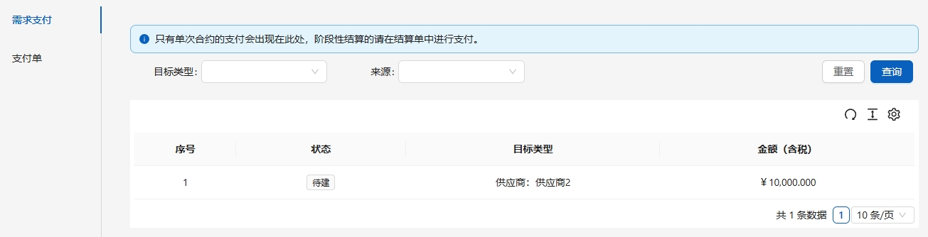 在[财务管理]-[付款单]-[需求支付]中显示需要立即支付的要求,例如周期性结算的支付,在[财务管理]-[结算单]中执行。