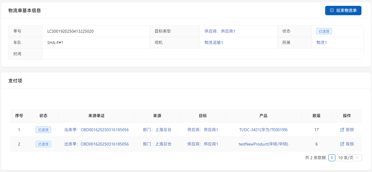 点击[结束物流单]完成物流,如有报损,则需立即处理报损单。