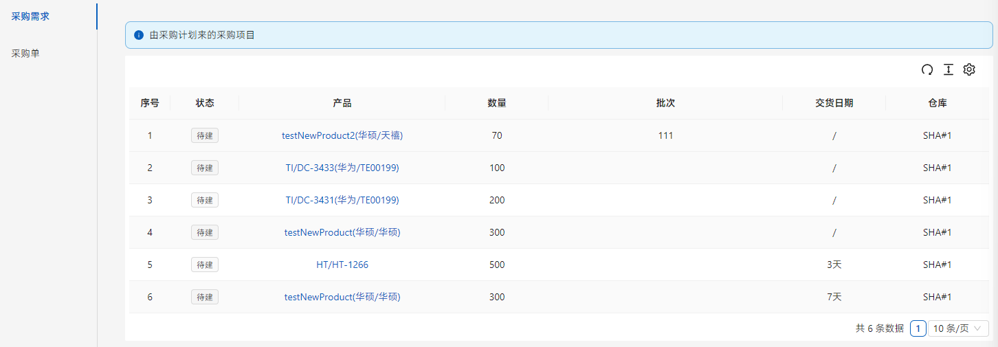 在[采购管理]-[采购单]中,[采购任务]中显示采购需求的项目。