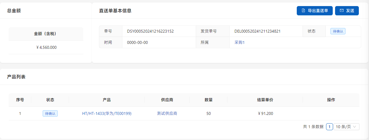 点击[导出直送单],按照供应商分别导出直送单,发送给供应商,点击[发送]。