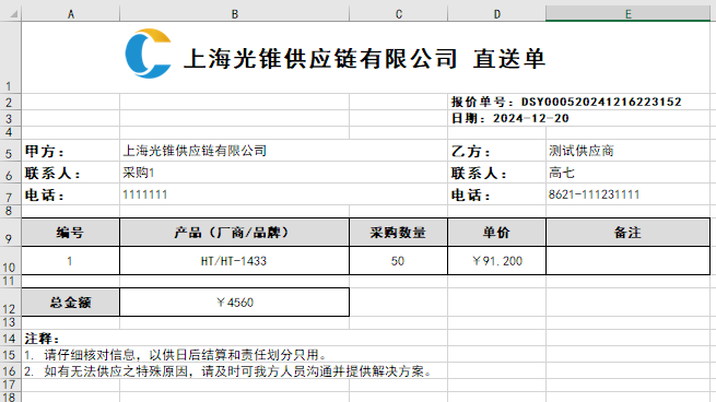 点击[确认直送单],按照供应商区分,如果有战略合约的推送支付和发票信息,如果没有则构建一个采购合同。