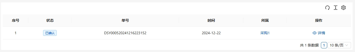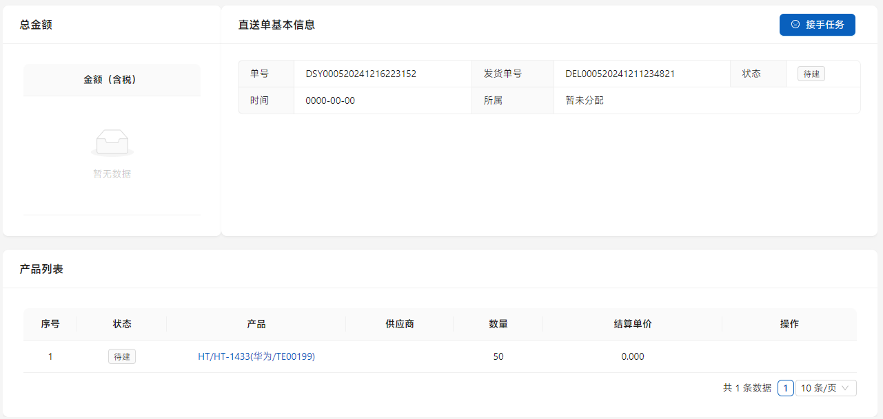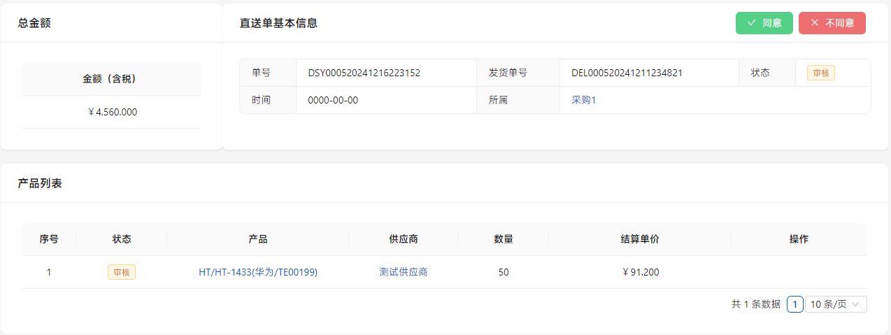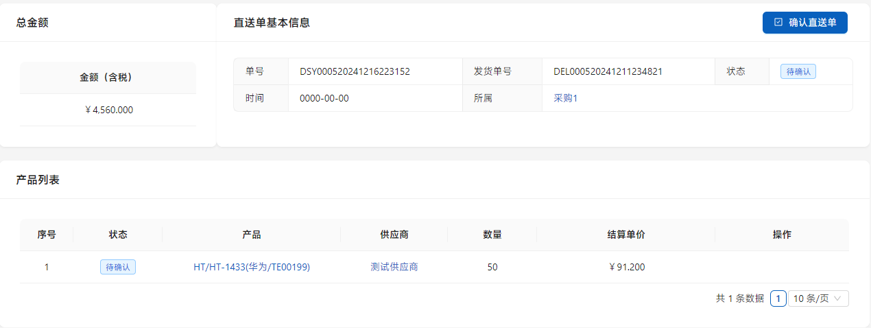在销售部门在销售单中选择供应商直供后,在[采购管理]-[直送单]中显示。点击列表右侧的[详情]进行操作。