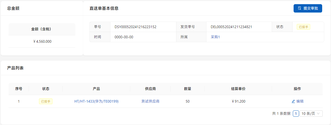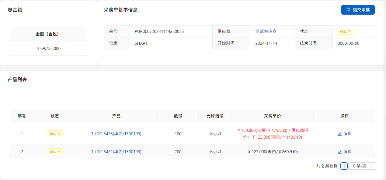 待供应商确认后,如果有变化,点击列表右侧的[编辑]进行修改,点击[提交审批]由审批人员进行确认。
