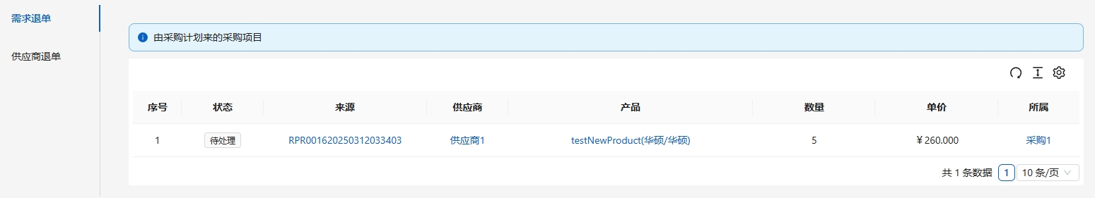 供应商退单是由退货处理单单生成的,需要向供应商退换货的单证。在[采购管理]-[供应商退单]-[需求退单]中显示需要退单的产品列表。