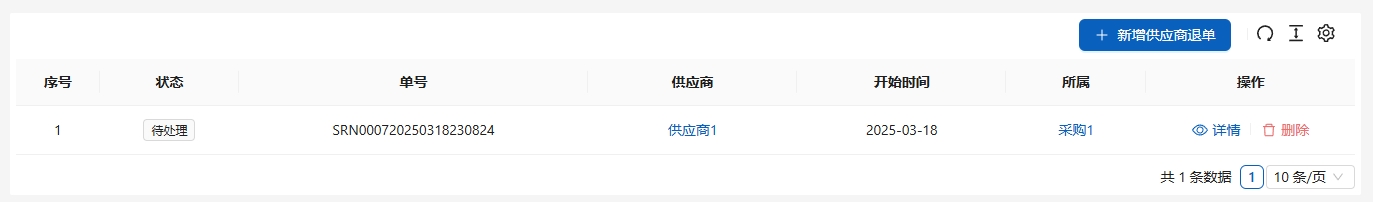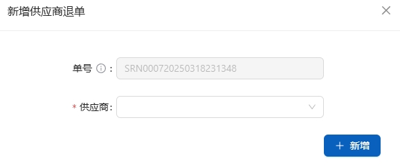 在[采购管理]-[供应商退单]-[供应商退单]中显示供应商退单列表。点击[新增供应商退单],新建供应商退单。