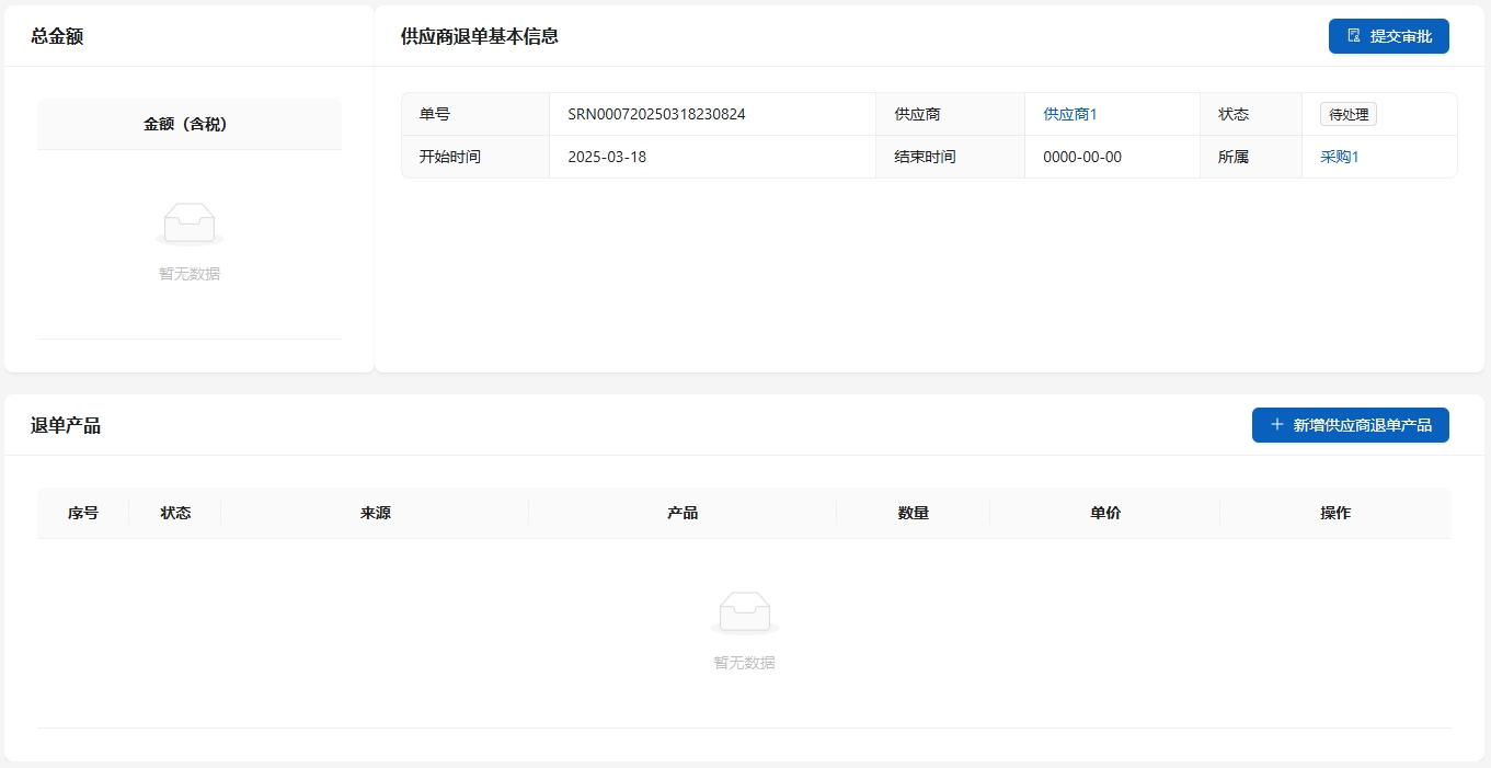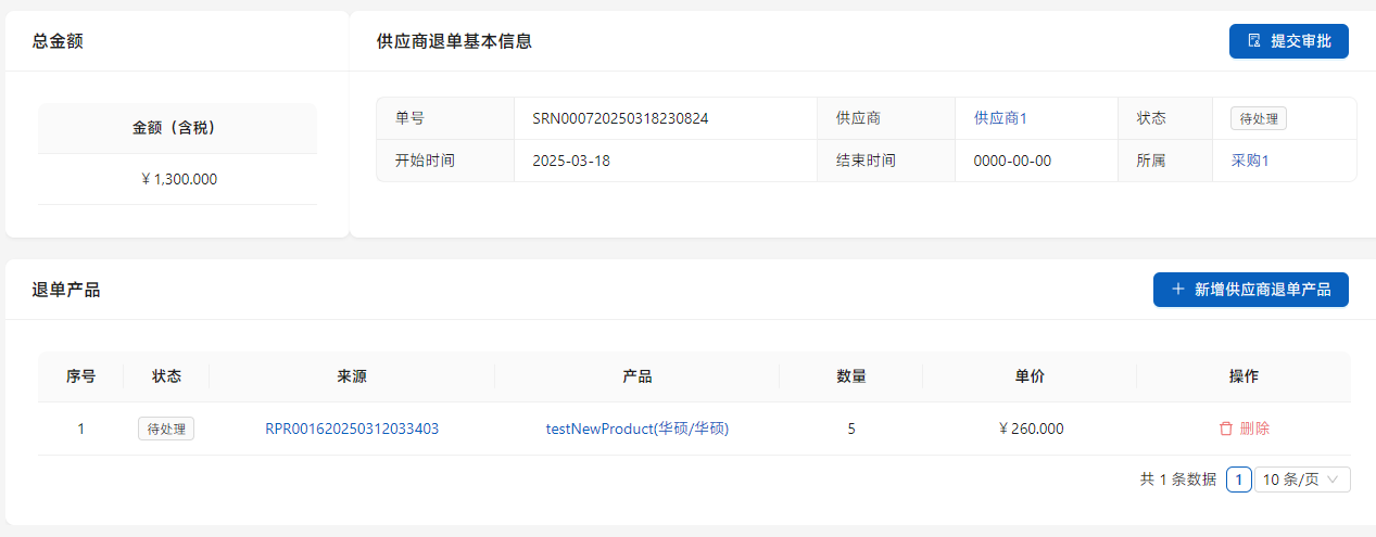 供应商退单是由入库退单或者售后单生成的,对退回产品进行处理的单证。在[采购管理]-[退货处理单]中显示。