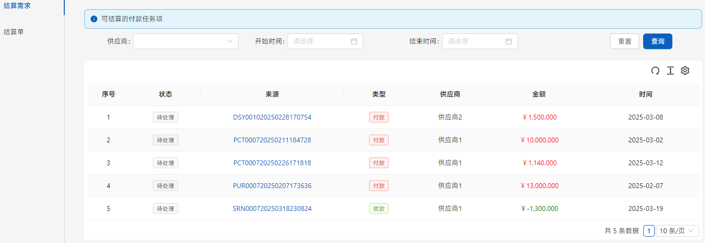 采购实施之后,签署过战略合约的需要周期性结算的供应商,会发送收货流程。在[仓储管理]-[入库单]-[入库需求]中展示。