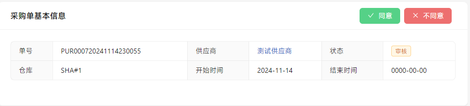 点击[同意]进行进行后续采购,点击[不同意]退回进行修改。