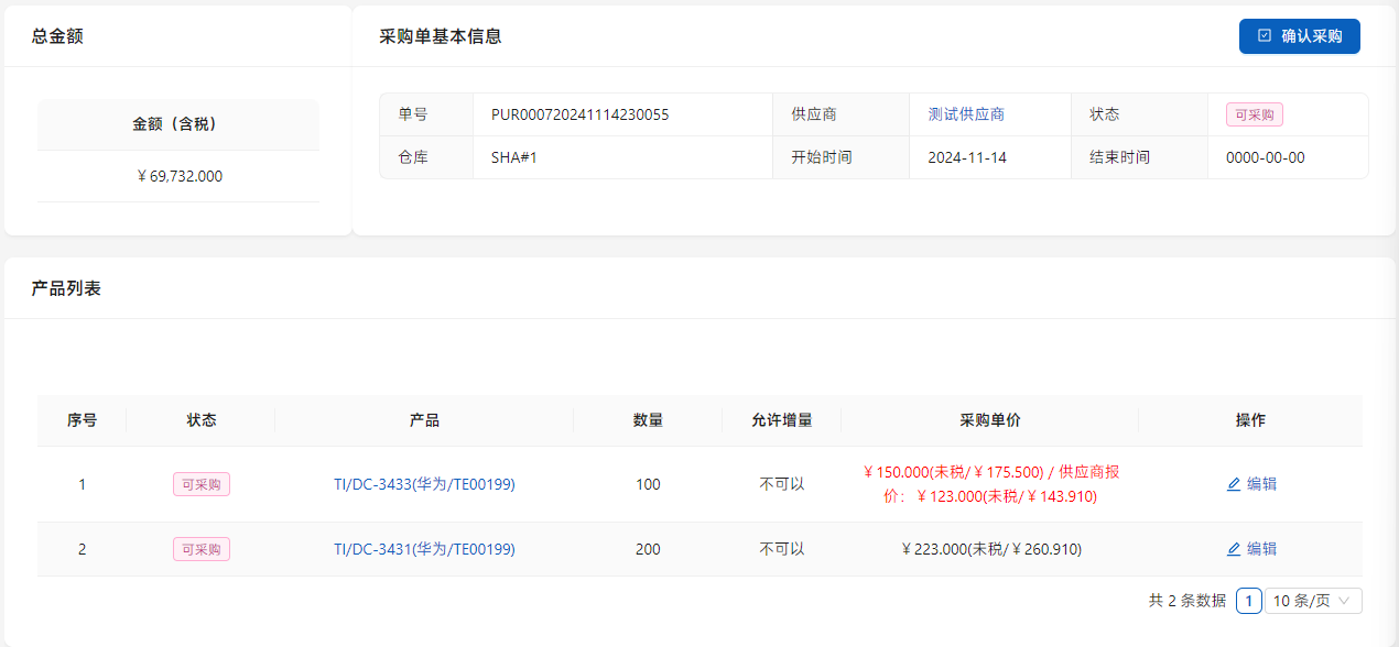 审核通过后,点击[确认采购]进行采购实施。