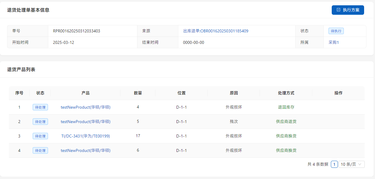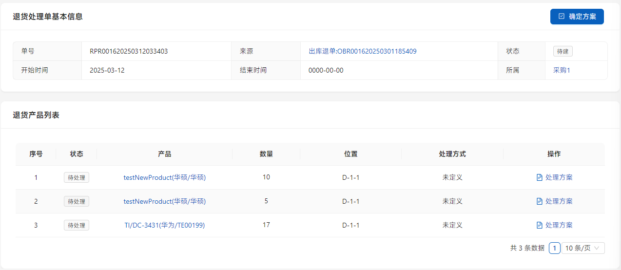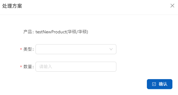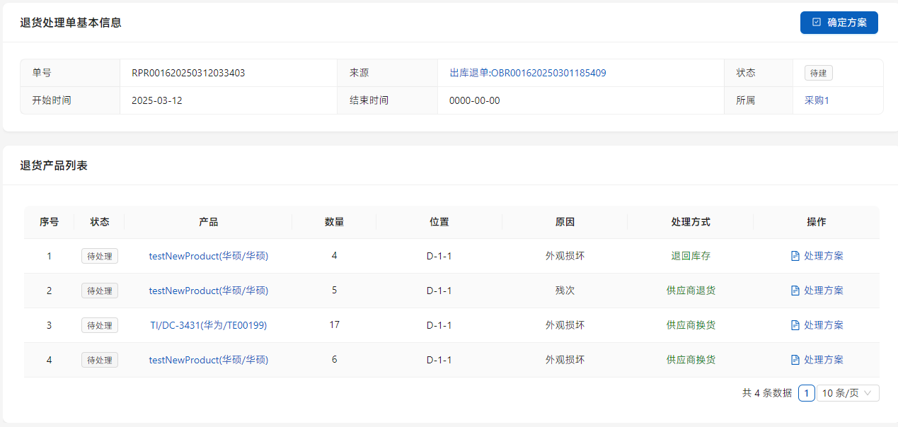 点击列表右侧的[处理方案]进行方案安排。如果产品不存在问题选择[退回库存],如果需要换货则选择[供应商换货],退货则选择[供应商退货],同时需要处理相应的[供应商退单]。同一项可以拆分不同的处理方案,只需在数量中进行填写。
