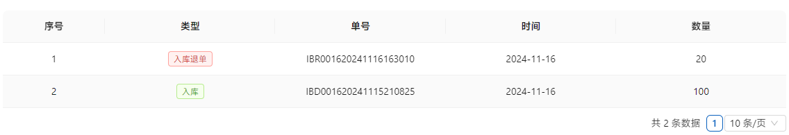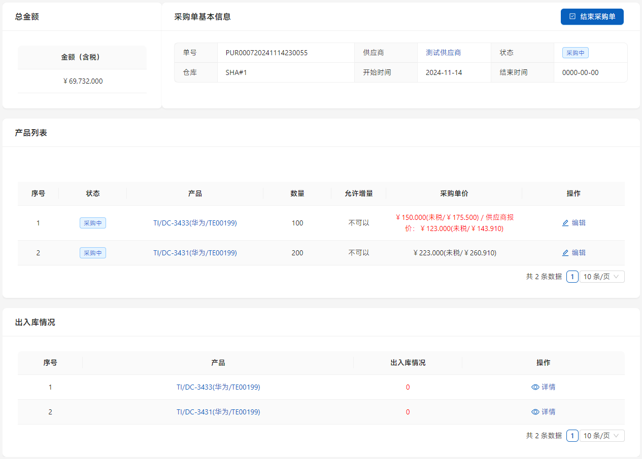 同时,在采购单中展示入库、退库等情况。