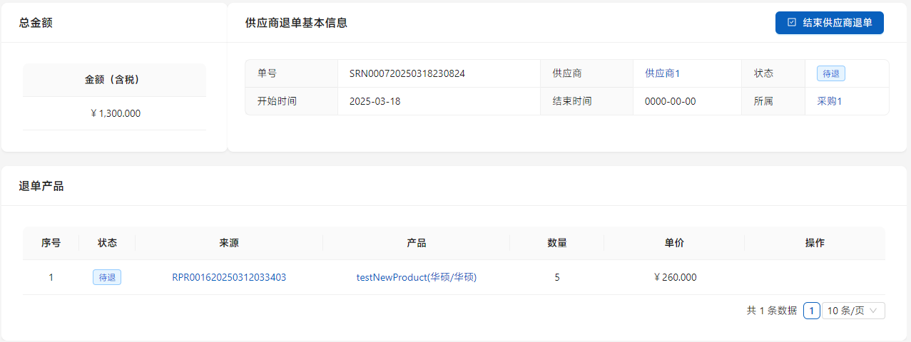 待审核通过后,点击[结束供应商退单],推送收款信息。