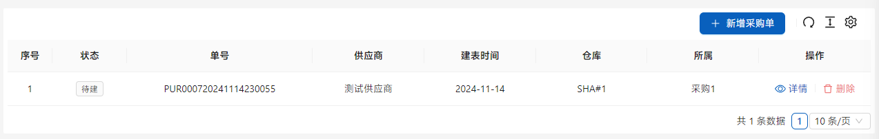 在[采购单]中点击[新建采购单]进行新建采购任务,请记得选择对应的接收仓库。