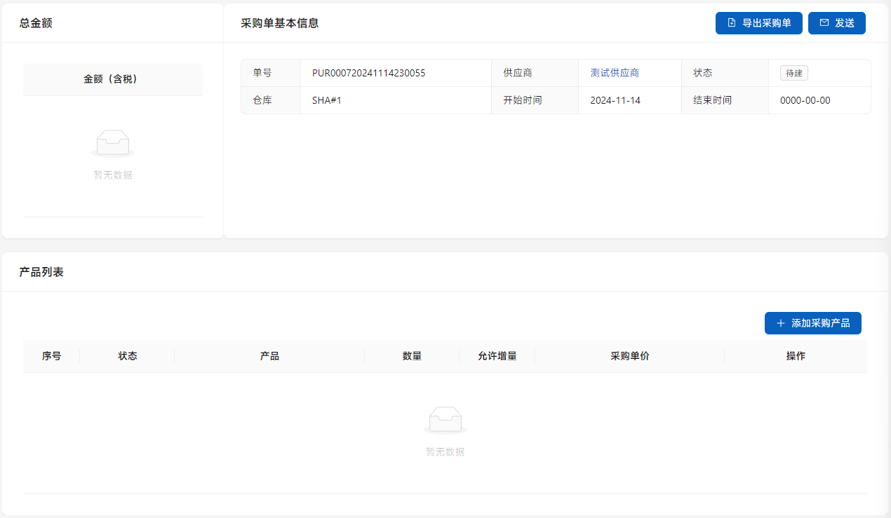 采购单中的总金额会统计展现在[总金额]栏目中。