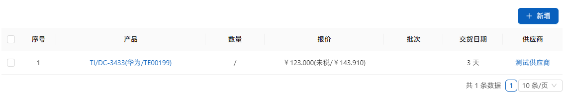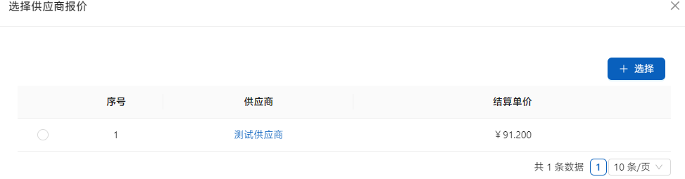 点击[选择]如果该供应商有相关产品的报价会显示在列表中,在适合的列表前面进行勾取,点击[新建]进行添加。