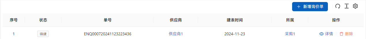 在[采购管理]-[询价单]-[询价单]中,点击[新增询价单]新建询价单。