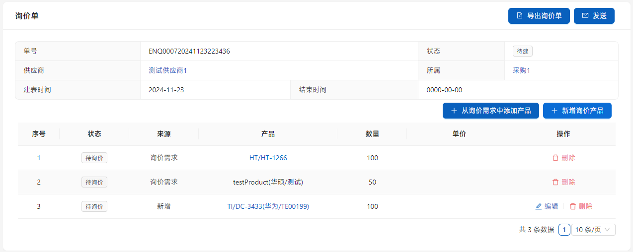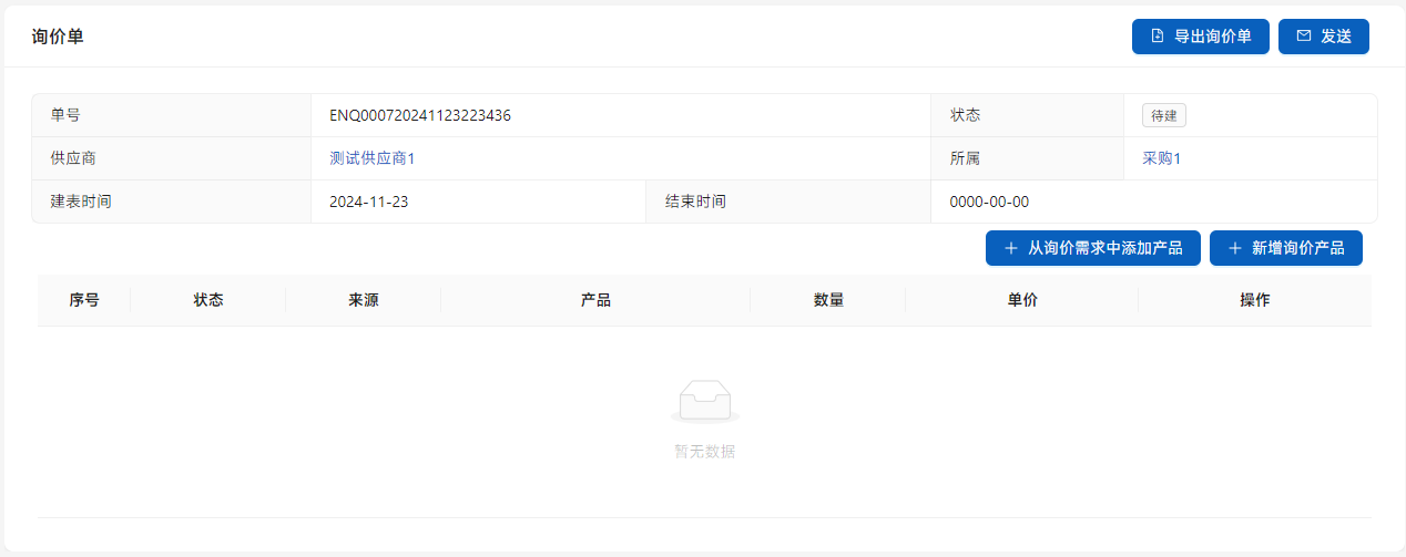 一个询价需求可以向多个供应商进行询价,待供应商都回复完毕后,再点击[结束询价],询价需求中的信息就会删除。