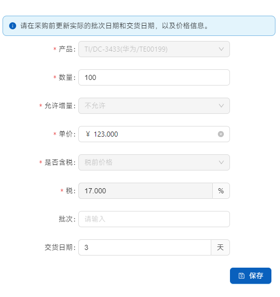 添加的产品采购需求数量是采购需求的所有数量,首先和供应商确认是否有足够的供货,如果供应商提供数量不足,或者需求多供应商分别采购分担风险,可以点击[编辑]进行修改。如果不足采购需求数量,剩余数量会仍旧展示在[采购需求中]。