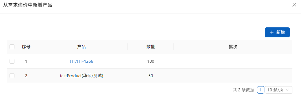 首先添加询价产品,点击[从询价需求中添加产品]是选择上述询价需求的产品。