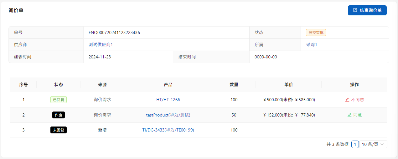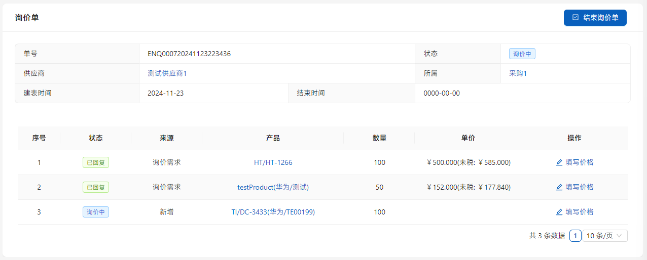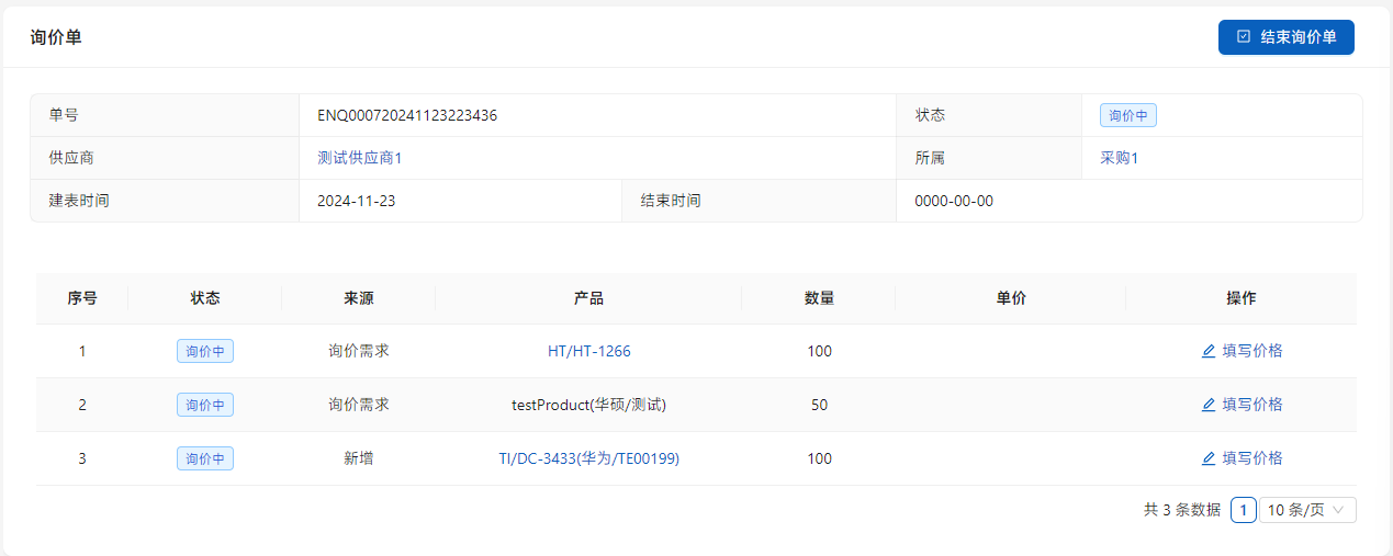 审核每个已有报价的项目,如果报价不符合公司要求一定要点击列表右侧的[结束询价单],这样在后续操作中将不会出现。点击[结束询价单]完结此次询价。