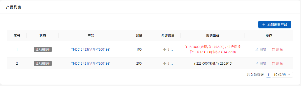 [从询价需求中添加产品]添加的产品无法修改信息,[新增询价产品]添加的产品,可以点击列表右侧的[编辑]修改信息。