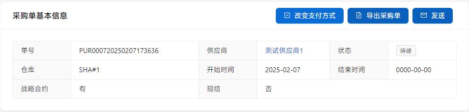 点击[改变支付方式]选择是现结还是按照战略协议进行周期性结算,如果没有战略协议则无法选取周期性结算方式。点击[导出采购单]发给供应商进行确认,导出的采购单展现在[文件]中,然后点击[发送]进行确认。