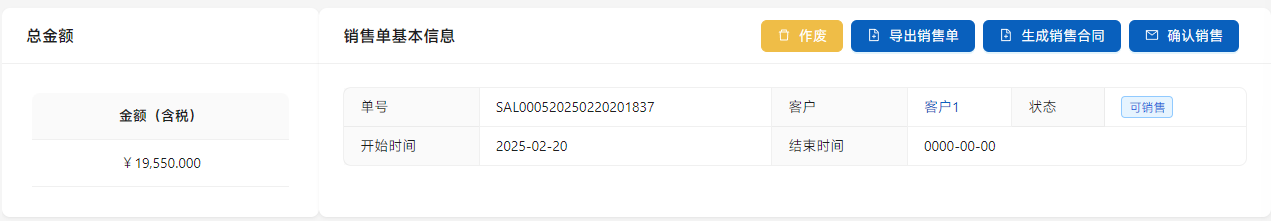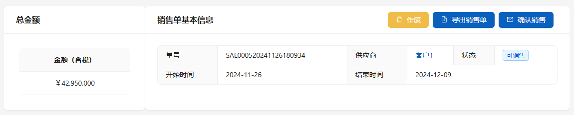 点击[导出销售单]以便和客户确认,点击[确认销售]结束销售单,同时生成发货单。在确认销售前还可以通过点击[作废]作废采购单。