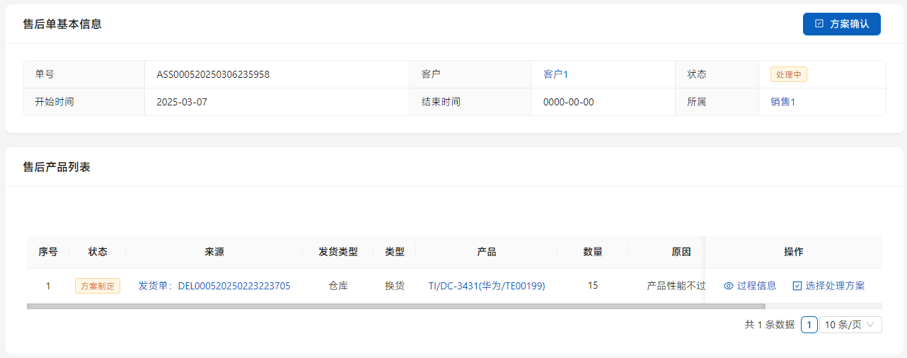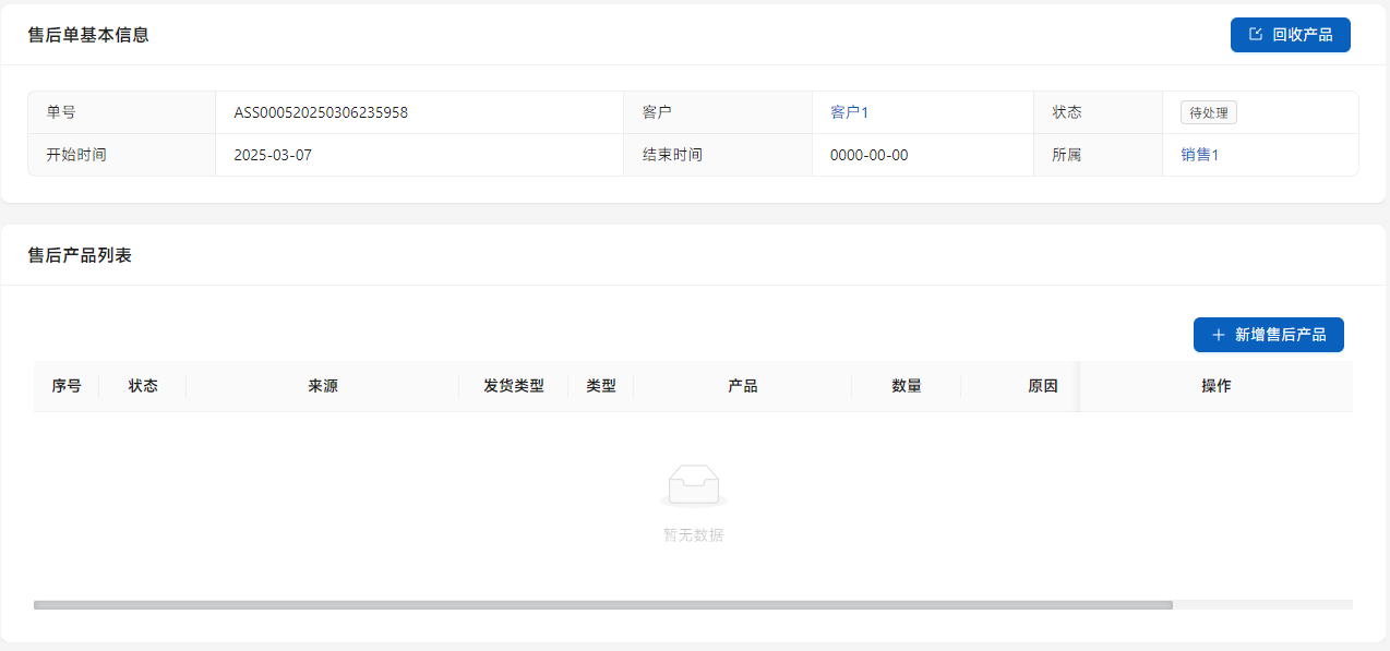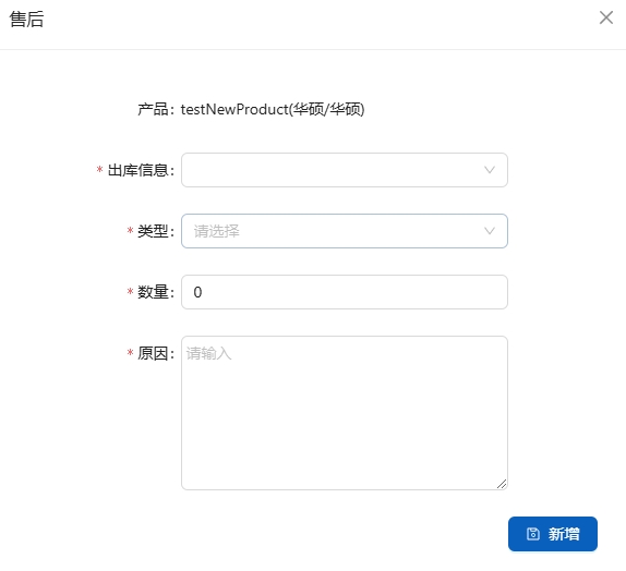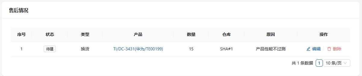 如果有售后情况,点击[售后],填写售后信息,售后可能需要多次,所以只生成售后需求信息,需要手工建立售后单。