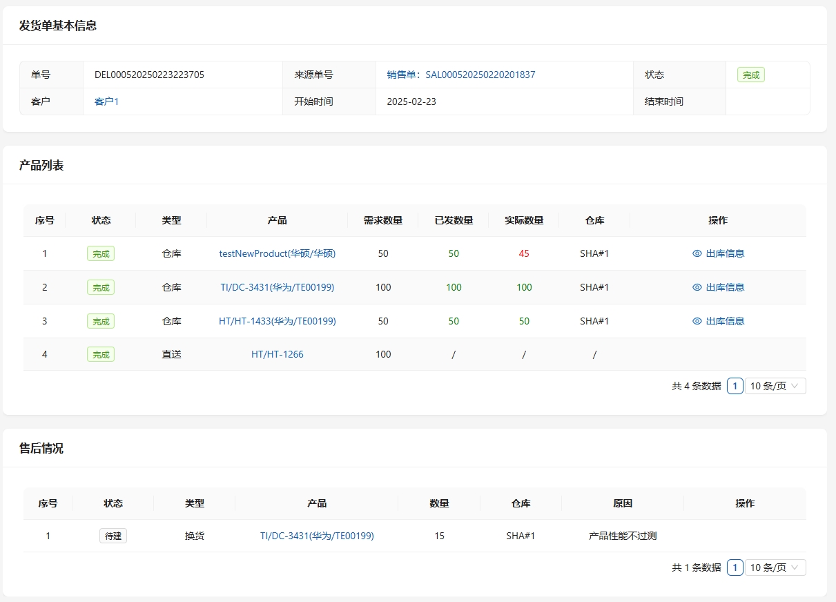 待所有产品均发货,而且没有售后情况了,点击[发货完毕],结束发货单。