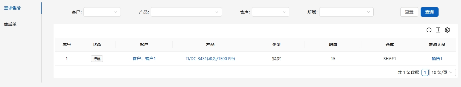售后单是客户收取货物之后,所需处理的产品问题的单证。在[业务管理]-[售后单]-[售后需求]中显示待处理的产品列表。