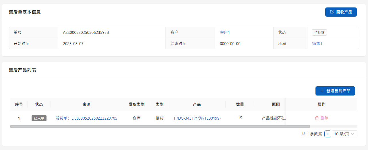点击[新增售后产品]把待处理的信息加入其中。