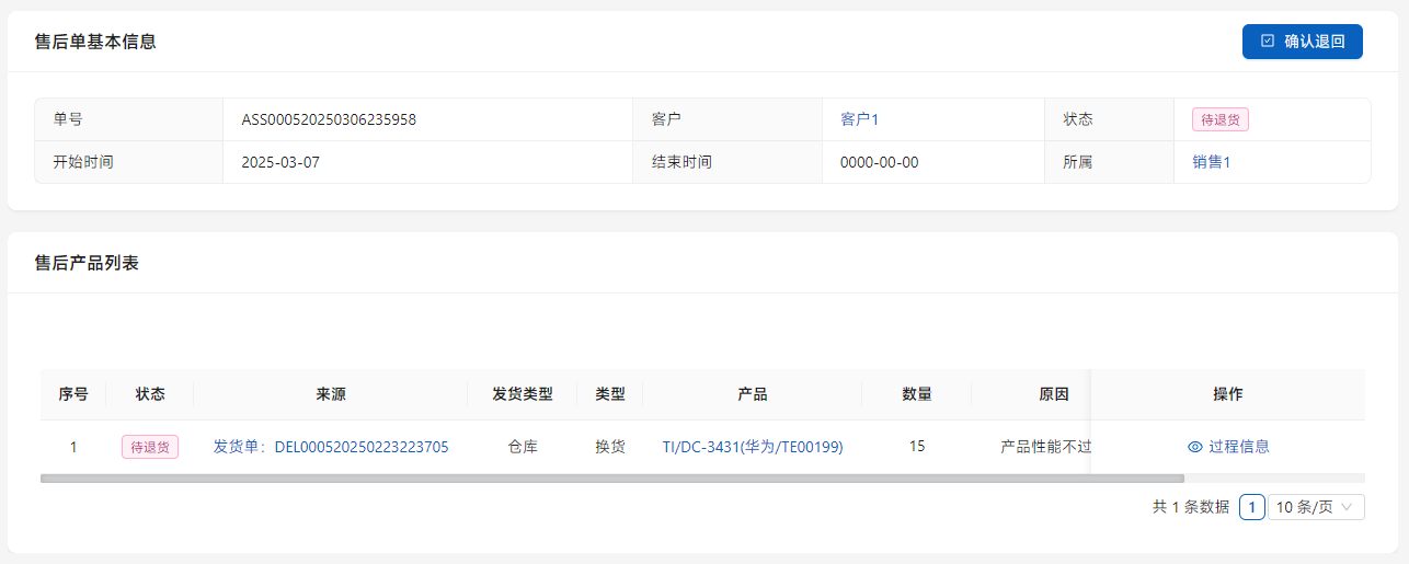 点击列表右侧的[确认退回]进行后续处理。