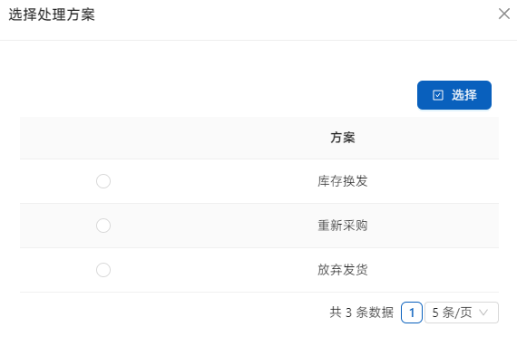 点击列表右侧的[选择处理方案]选择处理的方式。对于仓库发货的产品,可以选择[仓库重发]、[重新采购](库存无货),[放弃发货]。对于直送的,选择[供应商重发]