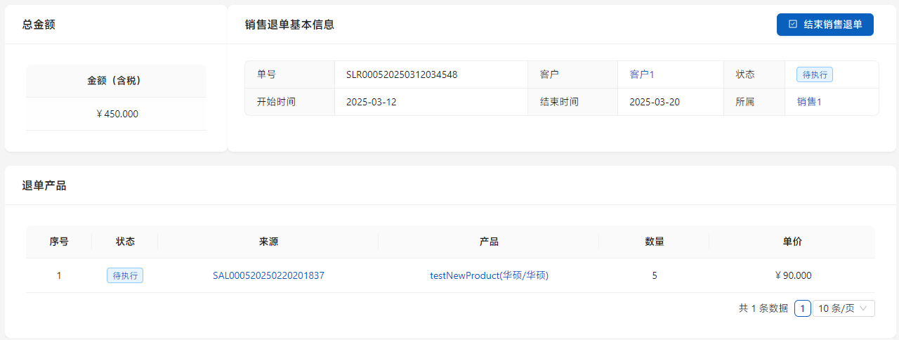 销售退单是销售之后,客户直接退单(出库退单),或者售后(售后单)时退货行程的单证,以供结算之用。在[业务管理]-[销售退单]中显示待处理的销售退单。