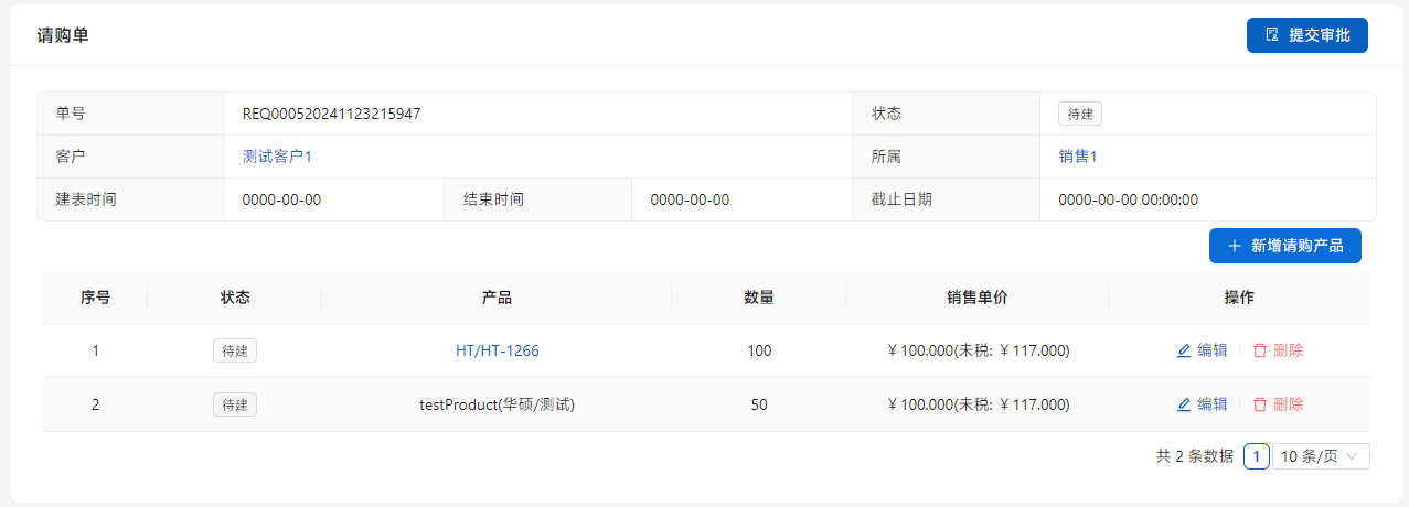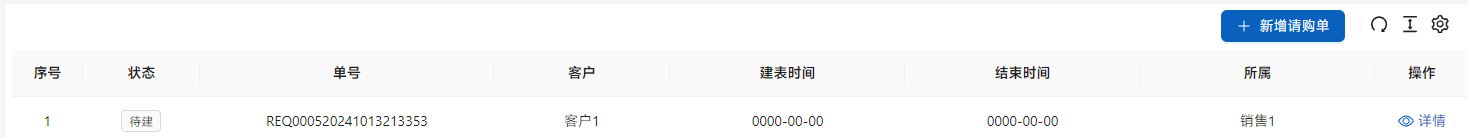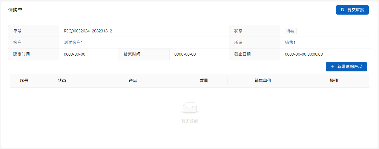 [请购单]是销售有需求,但是库中没有相应产品,向战略规划部门请求采购的单证。在[业务管理]-[请购单]中点击[新增请购单]添加请购单。