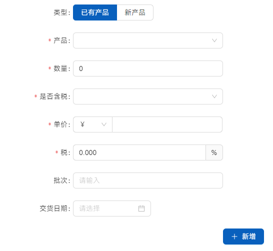 点击[新增请购产品]添加产品内容。[已有产品]为在产品库中已经登记的产品,[新产品]为未登记产品,即在[已有产品]选项的选择框内无法找到的产品。价格是客户拟支付价格,供战略规划部门考量是否值得加入采购计划。交货日期可选,是体现客户需求的紧急程度。