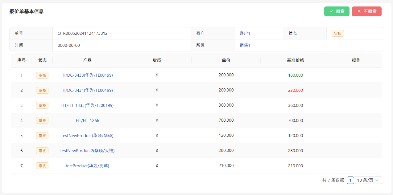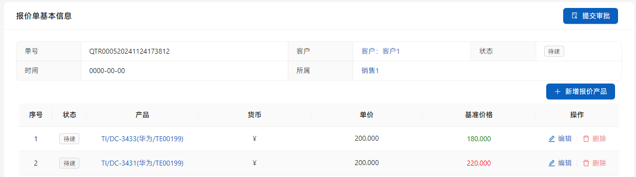 可以点击列表右侧的[编辑]调整报价价格,如果低于基准价格则显示绿色,如果高于则显示红色。点击[提交审批]。