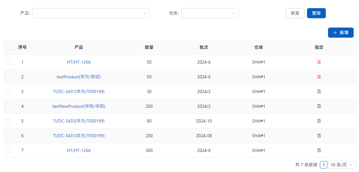 点击[从仓库添加],列表中是在库的产品。如果库中没有清填写请购单采购入库后再填写销售单。针对当前客户锁定的产品,会在[指定]栏目里标记红色的“是”。