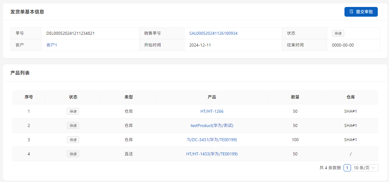 确认销售单以后进入发货流程,发货单是发货的单证。目的是为了发货时间可以拆分,无需同一时间一并执行。但为了避免直送的部分延迟造成供应商无法控制情况,直送部分一旦发货单审核通过,立即会被执行。在[业务管理]-[发货单]中显示列表。