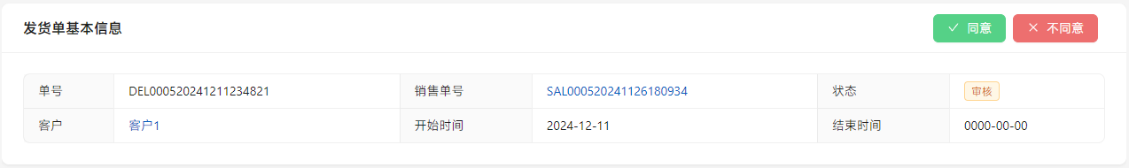 审批同意后,按处理方式生成后续单证。[仓库重发],生成发货单,并提前锁定仓库库存;[重新采购],生成请购单,以及发货单,供到货后仓库发货;[放弃发货],生成销售退单。对于直送的,生成[直送单]。