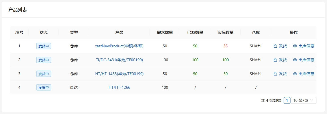 审核通过后,生成直送单,直送单的产品只能一次行全部发送,不支持分批发送。仓库发货的产品,需点击列表右侧[发货]向仓库发送出库要求。[需求数量]为发货单需要发出的产品数量,出库情况可根据,[已发数量]为已经提交仓库出库的数量(发货可以一次全发,或者选择分批发货),[实际数量]为发货过程中客户实际收到的数量,其中包括出库退单中需要扣除的数量。列表右侧的[出库信息]来查看。
